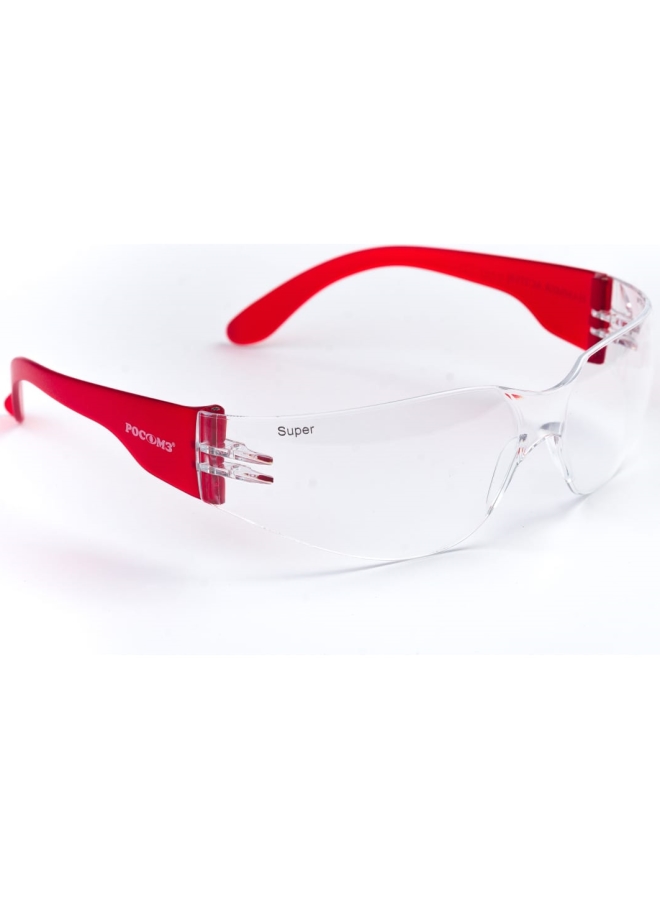 Панорамные линзы с односторонним покрытием от запотевания изнутри и от царапин снаружи. Два уровня защиты: фронтальный, боковой. Дужки одноцветные красные, без регулировки, заушники широкие.